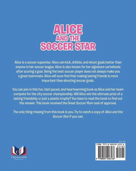 Alice is a soccer superstar. Alice can kick, dribble, and shoot goals better than anyone in her soccer league. Alice is also known for her signature cartwheels after scoring a goal. Being the best soccer player does not always make you a great teammate. Alice will soon find that making lasting friends is more important than shooting soccer goals. You can join in this fun, fast-paced, and heartwarming book as Alice and her team compete for the city soccer championship. Will Alice win the ultimate prize of a lasting friendship or just a plastic trophy? You have to read the book to find out the answer. This book received the Great Soccer Mom seal of approval. The only thing missing from this book is you. Try to catch a copy of Alice and the Soccer Star if you can.
