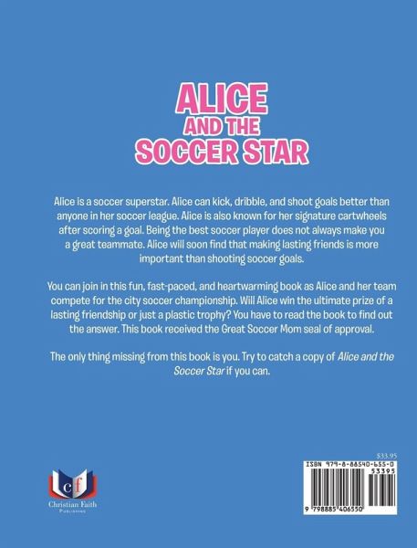 Alice is a soccer superstar. Alice can kick, dribble, and shoot goals better than anyone in her soccer league. Alice is also known for her signature cartwheels after scoring a goal. Being the best soccer player does not always make you a great teammate. Alice will soon find that making lasting friends is more important than shooting soccer goals. You can join in this fun, fast-paced, and heartwarming book as Alice and her team compete for the city soccer championship. Will Alice win the ultimate prize of a lasting friendship or just a plastic trophy? You have to read the book to find out the answer. This book received the Great Soccer Mom seal of approval. The only thing missing from this book is you. Try to catch a copy of Alice and the Soccer Star if you can.
