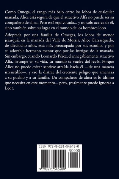 Como Omega, el rango más bajo entre los lobos de cualquier manada, Alice está segura de que el atractivo Alfa no puede ser su compañero de alma. Pero está equivocada... y no solo acerca de él, sino también sobre su lugar en el mundo de los hombres lobo. Adoptada por una familia de Omegas, los lobos de menor jerarquía en la manada del Valle de Morris, Alice Carrasquedo, de dieciocho años, está más preocupada por sus estudios y por su adorable hermano menor que por las intrigas de la manada. Sin embargo, cuando Leonardo Pérez, el innegablemente atractivo Alfa, irrumpe en su vida, su mundo se vuelve del revés. Porque Alice no puede evitar sentirse atraída hacia él -de una manera irresistible-, y eso la distrae del creciente peligro que amenaza a su pueblo y a su familia. Un compañero de alma es lo último que necesita en este momento... pero, ¿realmente puede ignorar a Leo?.