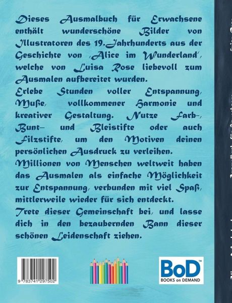Dieses Ausmalbuch für Erwachsene enthält wunderschöne Bilder von Illustratoren des 19. Jahrhunderts aus der Geschichte von 'Alice im Wunderland', welche von Helene Rose liebevoll zum Ausmalen aufbereitet wurden. Erlebe Stunden voller Entspannung, Muße, vollkommener Harmonie und kreativer Gestaltung. Nutze Farb-, Bunt- und Bleistifte oder auch Filzstifte, um den Motiven deinen persönlichen Ausdruck zu verleihen. Millionen von Menschen weltweit haben das Ausmalen als einfache Möglichkeit zur Entspannung, verbunden mit viel Spaß, mittlerweile wieder für sich entdeckt. Trete dieser Gemeinschaft bei, und lasse dich in den bezaubernden Bann dieser schönen Leidenschaft ziehen.-----------------------------------------------------------------------------------------Stichworte: Ausmalbuch für Erwachsene, Klassiker, Vintage, Old Fashion, Malen, Färben, Kolorieren, Ausmalen, Zeichnen, Freizeit, Hobby, Kunst, Handarbeit, Entspannung, Lebensführung, Anti Stress, Muße, Künstler, Ratgeber, Blumen, Märchen, Fantasy, Fiction, Historisch, Weihnachten, Geschenkbuch, Geburtstag, Geschenk, Ostern etc.