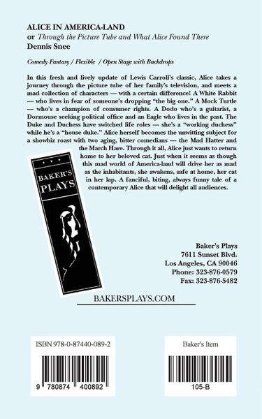 Comedy Fantasy Dennis Snee Large, flexible cast Alice in America-Land or, Through the Picture Tube and What Alice Found There In this fresh and lively update of Lewis Carroll's classic, Alice takes a journey through the picture tube of her family's television, and meets a mad collection of characters - with a certain difference! A White Rabbit - who lives in fear of someone's dropping "the big one." A Mock Turtle - who's a champion of consumer rights. A Dodo who's a guitarist, a Dormouse seeking political office and an Eagle who lives in the past. The Duke and Duchess have switched life roles - she's a "working duchess" while he's a "house duke." Alice herself becomes the unwitting subject for a showbiz roast with two aging, bitter comedians - the Mad Hatter and the March Hare. Through it all, Alice just wants to return home to her beloved cat. Just when it seems as though this mad world of America-land will drive her as mad as the inhabitants, she awakens, safe at home, her cat in her lap. A fanciful, biting, always funny tale of a contemporary Alice that will delight all audiences. The author is a noted comedy writer, who has written for such notables as Johnny Carson, Bob Hope, and Rodney Dangerfield. By author of Twain By the Tale