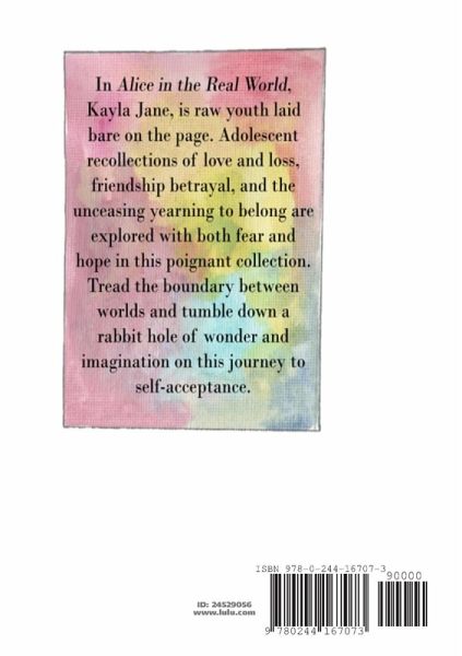 In 'Alice in the Real World', Kayla Jane is raw youth laid bare on the page. Adolescent recollections of love and loss, friendship and betrayal, and the unceasing yearning to belong, are explored with both fear and hope in this poignant collection. Tread the boundary between worlds and tumble down a rabbit hole of wonder and imagination on this journey of self acceptance.