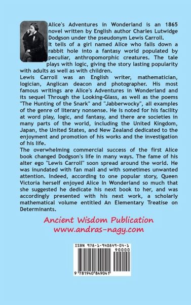 Alice's Adventures in Wonderland is an 1865 novel written by English author Charles Lutwidge Dodgson under the pseudonym Lewis Carroll. It tells of a girl named Alice who falls down a rabbit hole into a fantasy world populated by peculiar, anthropomorphic creatures. The tale plays with logic, giving the story lasting popularity with adults as well as with children.