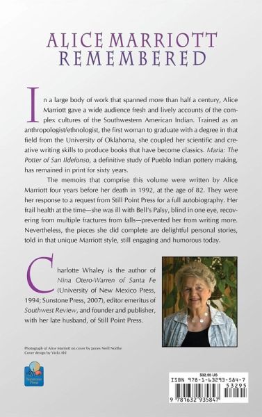 In her large body of work that spanned more than half a century, Alice Marriott gave a wide audience fresh and lively accounts of the complex cultures of the Southwestern American Indian. Trained as an anthropologist/ethnologist, the first woman to graduate with a degree in that field from the University of Oklahoma, she coupled her scientific and creative writing skills to produce books that have become classics. "Maria: The Potter of San Ildefonso," a definitive study of Pueblo Indian pottery making, has remained in print for sixty years. The memoirs that comprise this volume were written by Alice Marriott four years before her death in 1992, at the age of 82. They were her response to a request from Still Point Press for a full autobiography. Her frail health at the time-she was ill with Bell's Palsy, blind in one eye, recovering from multiple fractures from falls-prevented her from writing more. Nevertheless, the pieces she did complete are delightful personal stories, told in that unique Marriott style, still engaging and humorous today. Charlotte Whaley is the author of "Nina Otero-Warren of Santa Fe," also published by Sunstone Press; editor emeritus of "Southwest Review," and founder and publisher, with her late husband, of Still Point Press.