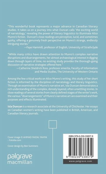 "This wonderful book represents a major advance inCanadian literary studies. It takes us on a journey into what Duncan calls 'the exciting world of narratology,' revealing the power of literary linguistics to illuminate Alice Munro's fiction. Duncan's close readings are perceptive, lucid, and sometimes quirky, offering a genuinely fresh perspective on Munro's strange, endlessly intriguing stories." - Faye Hammill, Professor of English, University of Strathclyde, UK
