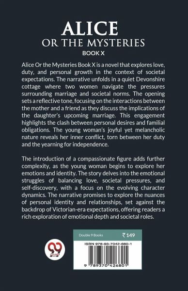 Alice Or the Mysteries Book X is a novel that explores love, duty, and personal growth in the context of societal expectations. The narrative unfolds in a quiet Devonshire cottage where two women navigate the pressures surrounding marriage and societal norms. The opening sets a reflective tone, focusing on the interactions between the mother and a friend as they discuss the implications of the daughter's upcoming marriage. This engagement highlights the clash between personal desires and familial obligations. The young woman's joyful yet melancholic nature reveals her inner conflict, torn between her duty and the yearning for independence. The introduction of a compassionate figure adds further complexity, as the young woman begins to explore her emotions and identity. The story delves into the emotional struggles of balancing love, societal pressures, and self-discovery, with a focus on the evolving character dynamics. The narrative promises to explore the nuances of personal identity and relationships, set against the backdrop of Victorian-era expectations, offering readers a rich exploration of emotional depth and societal roles.