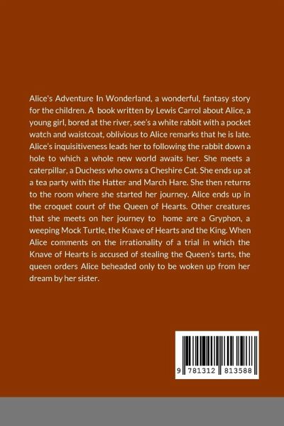 Alice's Adventure In Wonderland, a wonderful, fantasy story for the children. A book written by Lewis Carrol about Alice, a young girl, bored at the river, see's a white rabbit with a pocket watch and waistcoat, oblivious to Alice remarks that he is late. Alice's inquisitiveness leads her to following the rabbit down a hole to which a whole new world awaits her. She meets a caterpillar, a Duchess who owns a Cheshire Cat. She ends up at a tea party with the Hatter and March Hare. She then returns to the room where she started her journey. Alice ends up in the croquet court of the Queen of Hearts. Other creatures that she meets on her journey to home are a Gryphon, a weeping Mock Turtle, the Knave of Hearts and the King. When Alice comments on the irrationality of a trial in which the Knave of Hearts is accused of stealing the Queen's tarts, the queen orders Alice beheaded only to be woken up from her dream by her sister.