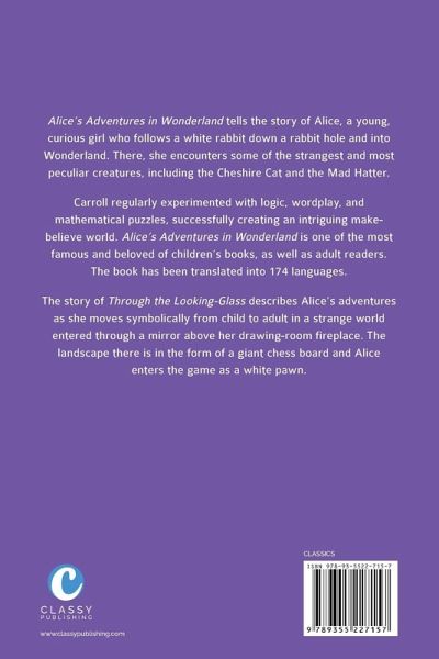 Alice's Adventures in Wonderland and Through the Looking-Glass together in one volume with more than 90 original illustrations by John Tenniel. Alice's Adventures in Wonderland tells the story of Alice, a young, curious girl who follows a white rabbit down a rabbit hole and into Wonderland. There, she encounters some of the strangest and most peculiar creatures, including the Cheshire Cat and the Mad Hatter. Carroll regularly experimented with logic, wordplay, and mathematical puzzles, successfully creating an intriguing make-believe world. Alice's Adventures in Wonderland is one of the most famous and beloved of children's books, as well as adult readers. The book has been translated into 174 languages. The story of Through the Looking-Glass describes Alice's adventures as she moves symbolically from child to adult in a strange world entered through a mirror above her drawing-room fireplace. The landscape there is in the form of a giant chess board and Alice enters the game as a white pawn.