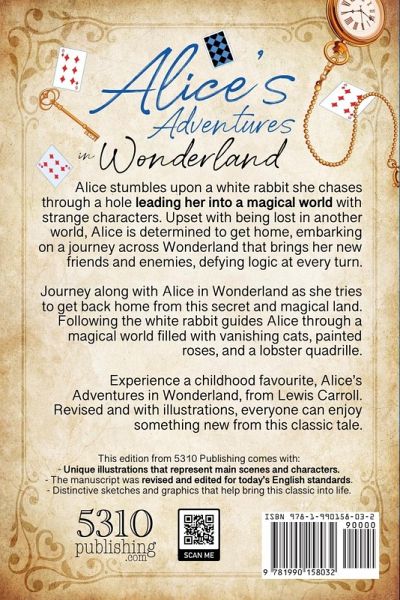 Alice stumbles upon a white rabbit she chases through a hole leading her into a magical world with strange characters. Upset with being lost in another world, Alice is determined to get home, embarking on a journey across Wonderland that brings her new friends and enemies, defying logic at every turn. Journey along with Alice in Wonderland as she tries to get back home from this secret and magical land. Following the white rabbit guides Alice through a magical world filled with vanishing cats, painted roses, and a lobster quadrille. Experience a childhood favorite, Alice's Adventures in Wonderland, from Lewis Carroll. Revised and with illustrations, everyone can enjoy something new from this classic tale. - Although written during the Victorian era, the adventures of the little girl who fell down a rabbit hole continue to have universal appeal today. Alice's Adventures in Wonderland is the story of a little girl who must face the challenges of growing up in an increasingly out-of-control world. Throughout her travels, Alice faces difficult situations. Her curiosity in seeing a pocket-watch-carrying white rabbit and following it into the strange world is what initially lands her in a predicament. Having done so, however, Alice accepts the consequences and sets about finding her way, making decisions on where to go, what to eat and how to act. Like any individual on the path to maturity, she does not always make the right choice, as when, in the white rabbit's house, she eats the biscuit and grows too large to get out of it. Despite the challenges and setbacks, however, Alice perseveres, facing the threats and intimidation of the Queen of Hearts during the croquet game to grow large enough to overcome adversity and find her way back where she belonged. Her story, in facing challenges and overcoming them, maturing in the process is familiar to child and adult alike. It accounts for its decades of continuing appeal, across continents and cultures, societies, and social divides. Next to the Bible and the works of Shakespeare, Alice's Adventures in Wonderland is the most quoted book in the world. - Initially published in 1865, Lewis Carroll's Alice's Adventures in Wonderland has been a classic for generations. Alice goes on adventures with White Rabbit, the most famous literary character, defies the crazy and terrifying Queen of Hearts, and joins the entertaining Mad Hatter, plus many other strange creatures. This edition from 5310 Publishing comes with: - Unique illustrations that represent main scenes and characters. - The manuscript was revised and edited for today's English standards. - Distinctive sketches and graphics that help bring this classic to life.