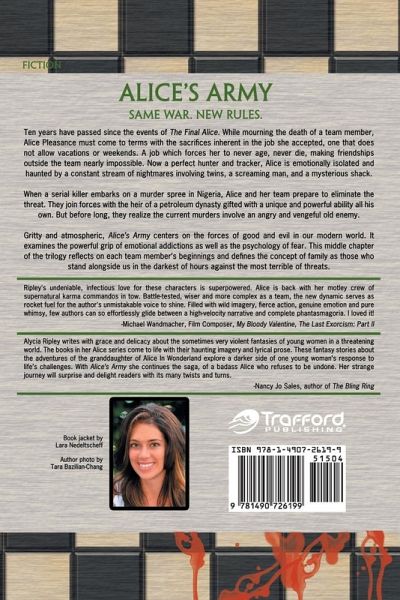 Ten years have passed since the events of The Final Alice. While mourning the death of a team member, Alice Pleasance must come to terms with the sacrifices inherent in the job she accepted, one that does not allow vacations or weekends. A job which forces her to never age and never die, making friendships outside the team nearly impossible. Now a perfect hunter and tracker, Alice is emotionally isolated and haunted by a constant stream of nightmares involving twins, a screaming man, and a mysterious shack. When a serial killer embarks on a murder spree in Nigeria, Alice and her team prepare to eliminate the threat. They join forces with the heir of a petroleum dynasty gifted with a unique and powerful ability all his own. But before long, they realize the current murders involve an angry and vengeful old enemy. Gritty and atmospheric, Alice’s Army centers on the forces of good and evil in our modern world. It examines the powerful grip of emotional addictions as well as the psychology of fear. This middle chapter of the trilogy reflects on each team member’s beginnings and defines the concept of family as those who stand alongside us in the darkest of hours against the most terrible of threats. Ripley's undeniable, infectious love for these characters is superpowered. Alice is back with her motley crew of supernatural karma commandos in tow. Battle-tested, wiser, and more complex as a team, the new dynamic serves as rocket fuel for the author's unmistakable voice to shine. Filled with wild imagery, fierce action, genuine emotion and pure whimsy, few authors can so effortlessly glide between a high-velocity narrative and complete phantasmagoria. I loved it! -Michael Wandmacher, film composer: My Bloody Valentine, The Last Exorcism: Part II Alycia Ripley writes with grace and delicacy about the sometimes very violent fantasies of young women in a threatening world. The books in her Alice series come to life with their haunting imagery and lyrical prose. These fantasy stories about the adventures of the granddaughter of Alice in Wonderland explore a darker side of one young woman's response to life's challenges. With Alice's Army she continues the saga of a badass Alice who refuses to be undone. Her strange journey will surprise and delight readers with its many twists and turns. -Nancy Jo Sales, author of The Bling Ring