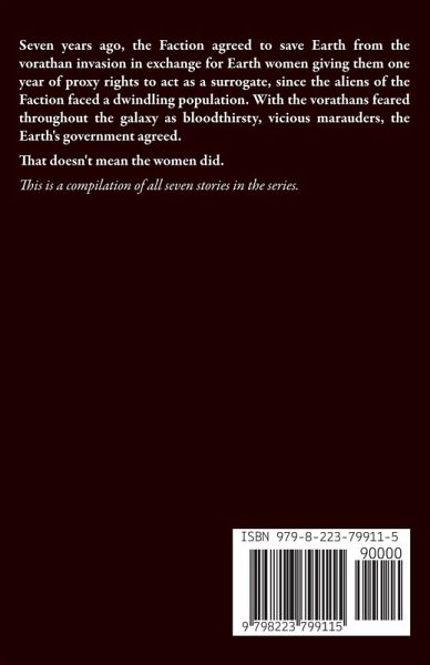 Seven years ago, the Faction agreed to save Earth from the vorathan invasion in exchange for Earth women giving them one year of proxy rights to act as a surrogate, since the aliens of the Faction faced a dwindling population. With the vorathans feared throughout the galaxy as bloodthirsty, vicious marauders, the Earth's government agreed. That doesn't mean the women did. This is a compilation of all seven stories in the series. Sometimes, you want to read about the entire alien empire and all its myriad twists and turns, immersing yourself in hundreds of pages of intrigue. And sometimes, you want to skip the frills and get to the main event. Juno and Aurelia are pleased to bring you a series of short, steamy romances about untouched human women making babies with their truly alien mates.