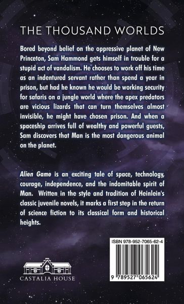 With nothing to do but work or lose himself in the dubious digital pleasures of the Netrix, Sam Hammond finds himself bored beyond belief on the oppressive planet of New Princeton. And when he gets himself in trouble for a stupid act of vandalism, he has the choice of spending a year in prison or working off his time as an indentured servant for anyone who buys his contract. He might have chosen the prison if he'd known that he'd find himself working security for a safari colony on a jungle world where the herbivores are the size of a stadium, the apex predators are vicious lizards that can turn themselves almost invisible, and the skies are filled with huge, acid-breathing fliers. And when New Princeton's Minister of Ecology arrives for a visit with a spaceship full of wealthy and powerful guests, Sam discovers that Man is the most dangerous animal on the planet. Rod Walker is the New New Heinlein, and The Thousand Worlds marks the return of science fiction to its classical form and historical heights. Written in the style and tradition of Robert Heinlein's 12 classic juvenile novels published by Scribner, ALIEN GAME is an exciting tale of space, adventure, courage, independence, and the indomitable spirit of Man.