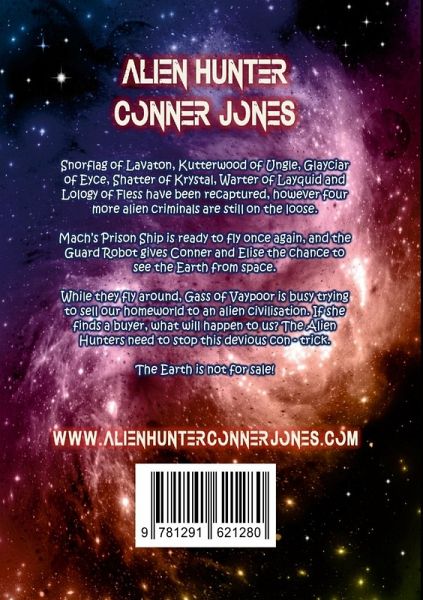 Snorflag of Lavaton, Kutterwood of Ungle, Glayciar of Eyce, Shatter of Krystal, Warter of Layquid and Lology of Fless have been recaptured, however four more alien criminals are still on the loose. Mach's prison ship is ready to fly once again, and the Guard Robot gives Conner and Elise the chance to see the Earth from space. While they fly around, Gass of Vaypoor is busy trying to sell our home-world to an alien civilisation. If she finds a buyer, what will happen to us? The Alien Hunters need to stop this devious con-trick. The Earth is not for sale!