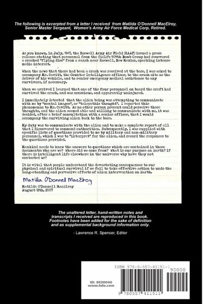 The "Readers Edition" is a simplified version of the book, ALIEN INTERVIEW. It does NOT include FOOTNOTES, INDEX or TABLE OF CONTENTS. Only the letters, personal notes and copies of top secret government interview transcripts from Roswell, N.M.. The interviews were conducted with the pilot of a crashed UFO at the US Army Air Force Base in July and August of 1947 under government direction by Flight Nurse Matilda O'Donnell MacElroy. (deceased)