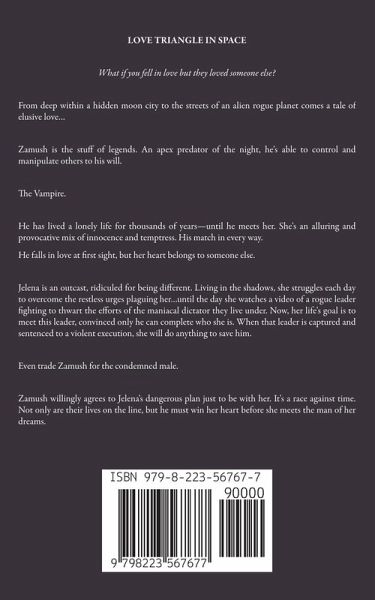 LOVE TRIANGLE IN SPACE What if you fell in love but they loved someone else? From deep within a hidden moon city to the streets of an alien rogue planet comes a tale of elusive love… Zamush is the stuff of legends. An apex predator of the night, he's able to control and manipulate others to his will. The Vampire. He has lived a lonely life for thousands of years-until he meets her. She's an alluring and provocative mix of innocence and temptress. His match in every way. He falls in love at first sight, but her heart belongs to someone else. Jelena is an outcast, ridiculed for being different. Living in the shadows, she struggles each day to overcome the restless urges plaguing her…until the day she watches a video of a rogue leader fighting to thwart the efforts of the maniacal dictator they live under. Now, her life's goal is to meet this leader, convinced only he can complete who she is. When that leader is captured and sentenced to a violent execution, she will do anything to save him. Even trade Zamush for the condemned male. Zamush willingly agrees to Jelena's dangerous plan just to be with her. It's a race against time. Not only are their lives on the line, but he must win her heart before she meets the man of her dreams.