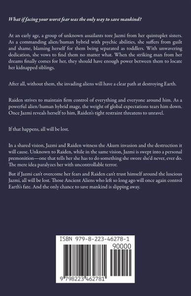 What if facing your worst fear was the only way to save mankind? At an early age, a group of unknown assailants tore Jazmi from her quintuplet sisters. As a commanding alien/human hybrid with psychic abilities, she suffers from guilt and shame, blaming herself for them being separated as toddlers. With unwavering dedication, she vows to find them no matter what. When the striking man from her dreams finally comes for her, they should have enough power between them to locate her kidnapped siblings. After all, without them, the invading aliens will have a clear path at destroying Earth. Raiden strives to maintain firm control of everything and everyone around him. As a powerful alien/human hybrid mage, the weight of global expectations tears him down. Once Jazmi reveals herself to him, Raiden's tight restraint threatens to unravel. If that happens, all will be lost. In a shared vision, Jazmi and Raiden witness the Akurn invasion and the destruction it will cause. Unknown to Raiden, while in the same vision, Jazmi is swept into a personal premonition-one that tells her she has to do something she swore she'd never, ever do. The mere idea paralyzes her with uncontrollable terror. But if Jazmi can't overcome her fears and Raiden can't trust himself around the luscious Jazmi, all will be lost. Those Ancient Aliens who left so long ago will once again control Earth's fate. And the only chance to save mankind is slipping away.