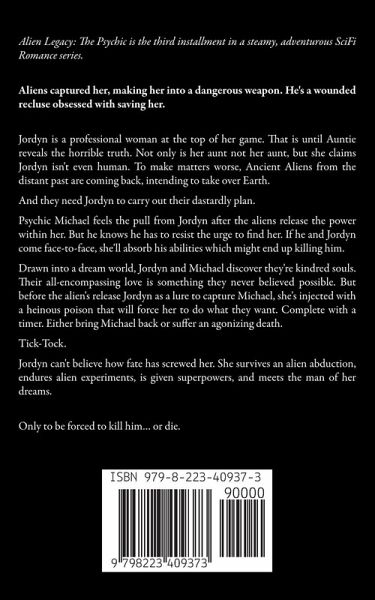 Alien Legacy: The Psychic is the third installment in a steamy, adventurous SciFi Romance series. Aliens captured her, making her into a dangerous weapon. He's a wounded recluse obsessed with saving her. Jordyn is a professional woman at the top of her game. That is until Auntie reveals the horrible truth. Not only is her aunt not her aunt, but she claims Jordyn isn't even human. To make matters worse, Ancient Aliens from the distant past are coming back, intending to take over Earth. And they need Jordyn to carry out their dastardly plan. Psychic Michael feels the pull from Jordyn after the aliens release the power within her. But he knows he has to resist the urge to find her. If he and Jordyn come face-to-face, she'll absorb his abilities which might end up killing him. Drawn into a dream world, Jordyn and Michael discover they're kindred souls. Their all-encompassing love is something they never believed possible. But before the alien's release Jordyn as a lure to capture Michael, she's injected with a heinous poison that will force her to do what they want. Complete with a timer. Either bring Michael back or suffer an agonizing death. Tick-Tock. Jordyn can't believe how fate has screwed her. She survives an alien abduction, endures alien experiments, is given superpowers, and meets the man of her dreams. Only to be forced to kill him… or die.