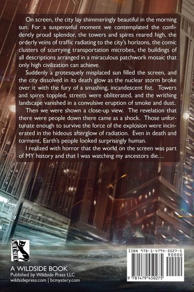 On screen, the city lay shimmeringly beautiful in the morning sun. For a suspenseful moment we contemplated the confidently proud splendor, the towers and spires reared high, the orderly veins of traffic radiating to the city’s horizons, the comic clusters of scurrying transportation microbes, the buildings of all descriptions arranged in a miraculous patchwork mosaic that only high civilization can achieve. Suddenly a grotesquely misplaced sun filled the screen, and the city dissolved in its death glow as the nuclear storm broke over it with the fury of a smashing, incandescent fist. Towers and spires toppled, streets were obliterated, and the writhing landscape vanished in a convulsive eruption of smoke and dust. Then we were shown a close-up view. The revelation that there were people down there came as a shock. Those unfortunate enough to survive the force of the explosion were incinerated in the hideous afterglow of radiation. Even in death and torment, Earth’s people looked surprisingly human. I realized with horror that the world on the screen was part of MY history and that I was watching my ancestors die…