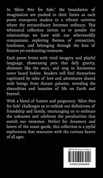 In "Alien Pets for Sale," the boundaries of imagination are pushed to their limits as each poem transports readers to a vibrant universe where the extraordinary becomes ordinary. This whimsical collection invites us to ponder the relationships we have with our otherworldly companions, exploring themes of connection, loneliness, and belonging through the lens of bizarre yet enchanting creatures. Each poem brims with vivid imagery and playful language, showcasing pets that defy gravity, shimmer like the stars, and sing in harmonies never heard before. Readers will find themselves captivated by tales of love and adventures shared with beings from distant galaxies, revealing the absurdities and beauties of life on Earth and beyond. With a blend of humor and poignancy, "Alien Pets for Sale" challenges us to rethink our definitions of friendship and family, encouraging us to embrace the unknown and celebrate the peculiarities that enrich our existence. Perfect for dreamers and lovers of the avant-garde, this collection is a joyful exploration that resonates with the curious hearts of all ages.