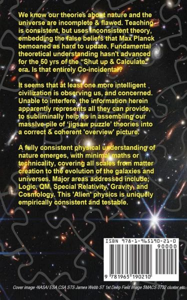 A report on apparent subliminal communication by intelligent Aliens who wish to help us advance our theoretical understanding of nature and the universe. Seemingly unable to communicate with or guide us directly, they've studied all our doctrinal and alternative theories and pointed to those consistent with their own far more advanced understanding. The many inconsistencies and anomalies in our current physics are resolved, often needing fundamental review of long held beliefs. The guidance is heuristic not mathematical, has proved empirically fully consistent and is far easier to understand then much terrestrial Physics theory. The subjects explained include all major fundamental areas including what we categorize as Relativity & Quantum Mechanics (causally unified), Logic, Dark Matter & Energy, Gravity, Cyclic Galaxy Evolution and Cosmology.