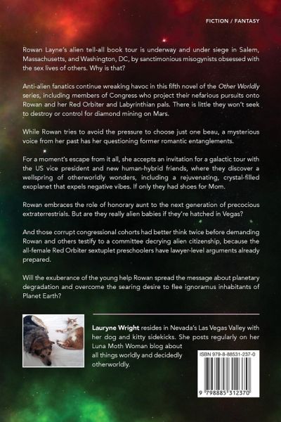 Rowan Layne's alien tell-all book tour is underway and under siege in Salem, Massachusetts, and Washington, DC, by sanctimonious misogynists obsessed with the sex lives of others. Why is that? Anti-alien fanatics continue wreaking havoc in this fifth novel of the Other Worldly series, including members of Congress who project their nefarious pursuits onto Rowan and her Red Orbiter and Labyrinthian pals. There is little they won't seek to destroy or control for diamond mining on Mars. While Rowan tries to avoid the pressure to choose just one beau, a mysterious voice from her past has her questioning former romantic entanglements. For a moment's escape from it all, she accepts an invitation for a galactic tour with the US vice president and new human-hybrid friends, where they discover a wellspring of otherworldly wonders, including a rejuvenating, crystal-filled exoplanet that expels negative vibes. If only they had shoes for Mom. Rowan embraces the role of honorary aunt to the next generation of precocious extraterrestrials. But are they really alien babies if they're hatched in Vegas? And those corrupt congressional cohorts had better think twice before demanding Rowan and others testify to a committee decrying alien citizenship, because the all-female Red Orbiter sextuplet preschoolers have lawyer-level arguments already prepared. Will the exuberance of the young help Rowan spread the message about planetary degradation and overcome the searing desire to flee ignoramus inhabitants of Planet Earth?