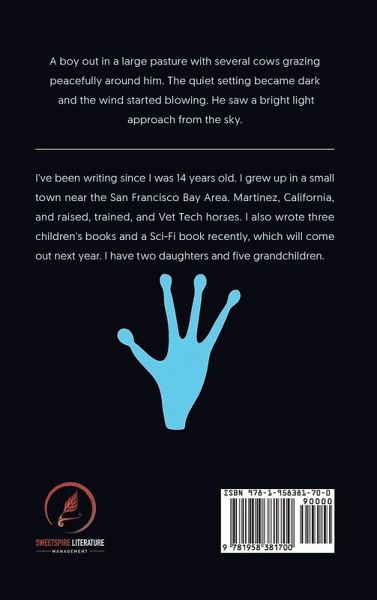 A boy out in a large pasture with several cows grazing peacefully around him. The quiet setting became dark and the wind started blowing. He saw a bright light approach from the sky.