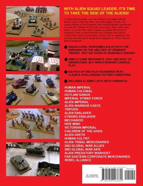 Alien Squad Leader is a Science Fiction miniatures wargame for 15mm scale models based as five-man squads, now in it's third edition. The basic concepts of the game are designed to be easy to pick up, with varied scenarios, army lists, and a range of tactical options to give added depth. Alien Squad Leader remains a uniquely fun game, and is intended to be different from the majority of Science Fiction miniatures rules currently available. It is an innovative development of HOTT/Warmaster, with a generic, B-Movie, Science-Fantasy feel, that allows you to play a game featuring between 50-100 model figures and around 5-10 model vehicles in about three hours. Now with the addition of individual characters and seven new army lists, enjoy even more variety and replayability than ever before!