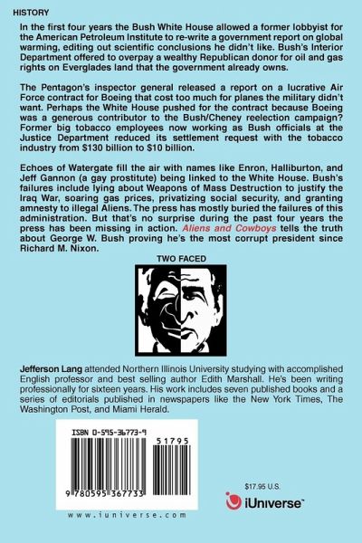 In the first four years the Bush White House allowed a former lobbyist for the American Petroleum Institute to re-write a government report on global warming, editing out scientific conclusions he didn't like. Bush's Interior Department offered to overpay a wealthy Republican donor for oil and gas rights on Everglades land that the government already owns. The Pentagon's inspector general released a report on a lucrative Air Force contract for Boeing that cost too much for planes the military didn't want. Perhaps the White House pushed for the contract because Boeing was a generous contributor to the Bush/Cheney reelection campaign? Former big tobacco employees now working as Bush officials at the Justice Department reduced its settlement request with the tobacco industry from $130 billion to $10 billion. Echoes of Watergate fill the air with names like Enron, Halliburton, and Jeff Gannon (a gay prostitute) being linked to the White House. Bush's failures include lying about Weapons of Mass Destruction to justify the Iraq War, soaring gas prices, privatizing social security, and granting amnesty to illegal Aliens. The press has mostly buried the failures of this administration. But that's no surprise during the past four years the press has been missing in action. Aliens and Cowboys tells the truth about George W. Bush proving he's the most corrupt president since Richard M. Nixon.