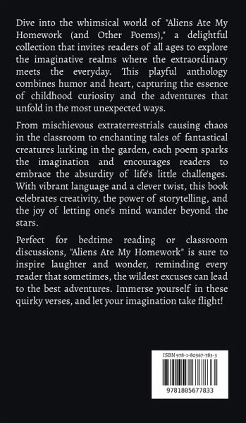 Dive into the whimsical world of "Aliens Ate My Homework (and Other Poems)," a delightful collection that invites readers of all ages to explore the imaginative realms where the extraordinary meets the everyday. This playful anthology combines humor and heart, capturing the essence of childhood curiosity and the adventures that unfold in the most unexpected ways. From mischievous extraterrestrials causing chaos in the classroom to enchanting tales of fantastical creatures lurking in the garden, each poem sparks the imagination and encourages readers to embrace the absurdity of life's little challenges. With vibrant language and a clever twist, this book celebrates creativity, the power of storytelling, and the joy of letting one's mind wander beyond the stars. Perfect for bedtime reading or classroom discussions, "Aliens Ate My Homework" is sure to inspire laughter and wonder, reminding every reader that sometimes, the wildest excuses can lead to the best adventures. Immerse yourself in these quirky verses, and let your imagination take flight!