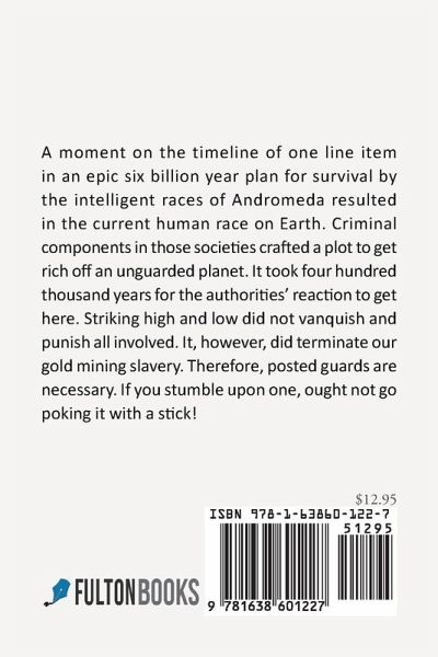 A moment on the timeline of one line item in an epic six billion year plan for survival by the intelligent races of Andromeda resulted in the current human race on Earth. Criminal components in those societies crafted a plot to get rich off an unguarded planet. It took four hundred thousand years for the authorities' reaction to get here. Striking high and low did not vanquish and punish all involved. It, however, did terminate our gold mining slavery. Therefore, posted guards are necessary. If you stumble upon one, ought not go poking it with a stick!
