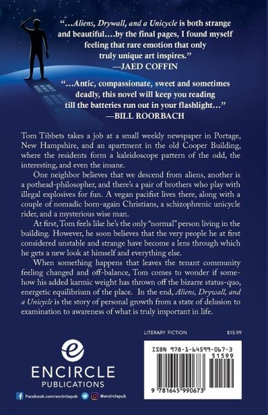 Tom Tibbets takes a job at a small weekly newspaper in Portage, New Hampshire, and an apartment in the old Cooper Building, where the residents form a kaleidoscope pattern of the odd, the interesting, and even the insane. One neighbor believes that we descend from aliens, another is a pothead-philosopher, and there's a pair of brothers who play with illegal explosives for fun. A vegan pacifist lives there, along with a couple of nomadic born-again Christians, a schizophrenic unicycle rider, and a mysterious wise man. At first, Tom feels like he's the only "normal" person living in the building. However, he soon believes that the very people he at first considered unstable and strange have become a lens through which he gets a new look at himself and everything else. When something happens that leaves the tenant community feeling changed and off-balance, Tom comes to wonder if somehow his added karmic weight has thrown off the bizarre status-quo, energetic equilibrium of the place. In the end, Aliens, Drywall, and a Unicycle is the story of personal growth from a state of delusion to examination to awareness of what is truly important in life.