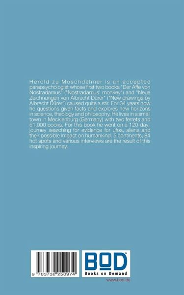 Herold zu Moschdehner is an accepted parapsychologist whose first two books "Der Affe von Nostradamus" ("Nostradamus' monkey") and "Neue Zeichnungen von Albrecht Dürer" ("New drawings by Albrecht Dürer") caused quite a stir. For 34 years now he questions given facts and explores new horizons in science, theology and philosophy. He lives in a small town in Mecklenburg (Germany) with two ferrets and 51,000 books. For this book he went on a 120-day-journey searching for evidence for ufos, aliens and their possible impact on humankind. 5 continents, 84 hot spots and various interviews are the result of this inspiring journey.
