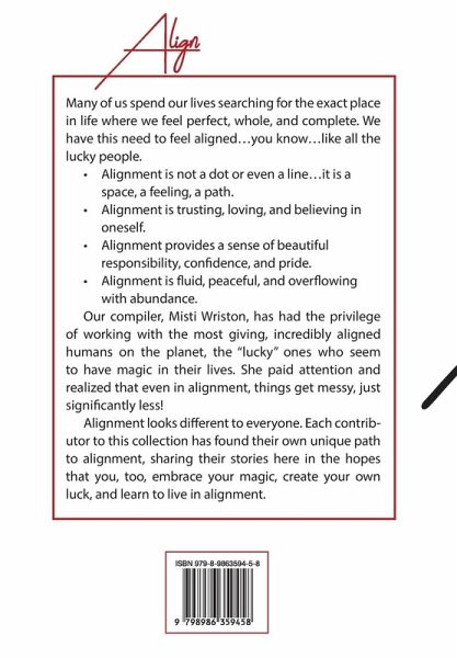 Many of us spend our lives searching for the exact place in life where we feel perfect, whole, and complete. We have this need to feel aligned...you know...like all the lucky people. * Alignment is not a dot or even a line...it is a space, a feeling, a path. * Alignment is trusting, loving, and believing in oneself. * Alignment provides a sense of beautiful responsibility, confidence, and pride. * Alignment is fluid, peaceful, and overflowing with abundance. Our compiler, Misti Wriston, has had the privilege of working with the most giving, incredibly aligned humans on the planet, the "lucky" ones who seem to have magic in their lives. She paid attention and realized that even in alignment, things get messy, just significantly less! Alignment looks different to everyone. Each contributor to this collection has found their own unique path to alignment, sharing their stories here in the hopes that you, too, embrace your magic, create your own luck, and learn to live in alignment.