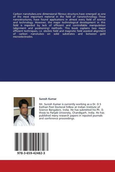 Carbon nanotubes,one dimensional fibrous structure,have emerged as one of the most important material in the field of nanotechnology. These nanostructures, have found applications in almost every field of science and technology. However, the major technological development in this field is impeded by lack of efficient and controllable manipulation (alignment and positioning) methods. This book explains two major efficient techniques, i.e. electric field and magnetic field assisted alignment of carbon nanotubes on solid substrates and between gold microelectrodes.