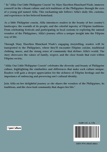 " In "Alila: Our Little Philippine Cousin" by Mary Hazelton Blanchard Wade, immerse yourself in the vibrant culture and rich traditions of the Philippines through the eyes of a young girl named Alila. This enchanting tale follows Alila's daily life, customs, and experiences in her beloved homeland. As a little Philippine cousin, Alila introduces readers to the beauty of her country's landscapes, the warmth of its people, and the colorful tapestry of Filipino traditions. From celebrating festivals and participating in local customs to exploring the natural wonders of the Philippines, Alila's journey offers a unique insight into the Filipino way of life. Through Mary Hazelton Blanchard Wade's engaging storytelling, readers will be transported to the Philippines, where they'll encounter Filipino cuisine, traditional clothing, music, and the strong sense of community that defines Alila's world. The story showcases the values of family, respect, and the close bonds that exist within Filipino society. "Alila: Our Little Philippine Cousin" celebrates the diversity and beauty of Philippine culture, highlighting the similarities and differences that make each culture unique. Readers will gain a deeper appreciation for the richness of Filipino heritage and the importance of embracing and preserving one's cultural identity. Join Alila on her delightful journey as she shares the wonders of the Philippines, its traditions, and the close-knit community that shapes her life."