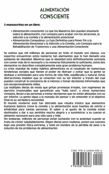 Dos manuscritos en un libro:Alimentación consciente: Lo que los Maestros Zen pueden enseñarle sobre la alimentación, con consejos para acabar con los atracones, la adicción a la comida y la alimentación emocional Alimentación Compulsiva: La Guía Definitiva para Poner Fin a la Alimentación Emocional y la Adicción a la Comida, con Consejos para la Rehabilitación de Trastornos y una Alimentación Consciente Algunos de los temas y preguntas cubiertos en la primera parte de este libro incluyen:Lo que es la alimentación consciente, cómo funciona, y su historia Los beneficios de esta técnica y lo que promete El papel que juega la alimentación consciente en el tratamiento de los trastornos alimenticios, incluyendo los atracones y el exceso de comida Lo que los Maestros Zen tienen que enseñar sobre el exceso de comida, los atracones y la comida emocional Varios consejos, trucos y sugerencias para comenzar el maravilloso viaje de la alimentación consciente Un enfoque paso a paso para ayudar a construir hábitos alimenticios conscientes 17 inspiradoras historias de éxito de celebridades Algunos de los temas y preguntas cubiertos en la segunda parte de este libro incluyen:Lo que REALMENTE ES el trastorno por atracón. Las MENTIRAS RIDÍCULAS sobre la alimentación compulsiva que le hacen sentirse peor con usted mismo. La CIENCIA EXACTA detrás de cada episodio de atracones. Los APARENTES DETALLES SIN IMPORTANCIA que le hacen caer en atracones y cómo deshacerse de ellos. 9 MITOS sobre la alimentación compulsiva. Pasos SUPER SENCILLOS para PONER FIN a los atracones PARA SIEMPRE. 10 INSPIRADORAS HISTORIAS de famosos que lucharon contra el trastorno de alimentación compulsiva. PODEROSAS técnicas de mindfulness para ayudarle a poner fin a la alimentación compulsiva. Un plan nutricional FÁCIL Y SENCILLO para mantener a raya su impulso de comer descontroladamente. ... ¡Y mucho, mucho más! ¡Obtenga este libro ahora para aprender más sobre la alimentación consciente y la alimentación compulsiva!