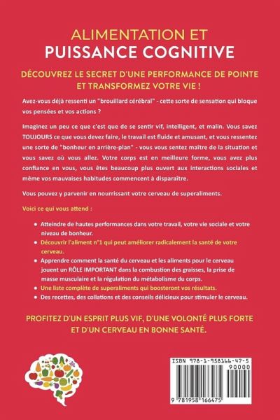 Découvrez le secret de la performance de pointe et transformez votre vie ! Avez-vous déjà eu des jours... où vous ne pouviez tout simplement pas... réfléchir... clairement ? Aimeriez-vous bénéficier d'un esprit vif, d'une volonté plus forte et d'un cerveau en bonne santé ? Si c'est le cas, continuez à lire ! Vous pouvez atteindre cet état, et le vivre, jour après jour, en apportant quelques modifications à votre régime alimentaire. Votre cerveau est l'organe principal de votre corps. Tout est contrôlé par cet ordinateur complexe, qui fait fonctionner l'ensemble de votre corps, de la tête aux pieds, de la vue à la digestion, des sentiments d'estime de soi au stress et à l'anxiété. En nourrissant votre cerveau avec des aliments spécifiques, tels que le poisson, les myrtilles et même le café, vous l'aidez à fonctionner beaucoup plus efficacement. Et avec un cerveau en bonne santé, vous pouvez vous attendre à :prendre des habitudes positives, sans effort. supprimer les mauvaises habitudes telles que le tabagisme, l'hyperphagie et la vulnérabilité émotionnelle. améliorer votre métabolisme et votre forme physique. atteindre vos objectifs sans vous relâcher. Dans ce livre complet, vous découvrirez comment nourrir votre cerveau avec les nutriments dont il a besoin, améliorer radicalement la santé de votre cerveau et aiguiser votre esprit au plus haut niveau ! Voici ce à quoi vous pouvez vous attendre :atteindre des performances élevées dans votre travail, votre vie sociale et votre niveau de bonheur. savoir exactement quoi manger lorsque vous avez un "brouillard cérébral" qui sabote votre travail. révéler l'aliment n°1 qui peut améliorer radicalement la santé de votre cerveau (indice : vous allez probablement l'ADORER !) apprendre comment la santé du cerveau et les aliments pour le cerveau jouent un RÔLE IMPORTANT dans la combustion des graisses, la prise de masse musculaire et la régulation du métabolisme du corps. une liste complète de super-aliments qui vont booster vos résultats. des recettes, des collations et des conseils délicieux pour stimuler le cerveau. Ne dites pas "ça ne marchera pas pour moi". Ce livre est le fruit de recherches approfondies, d'études et de preuves scientifiques. Il ne s'agit pas d'un livre de recettes générales - il contient UNIQUEMENT des recettes pour le cerveau et des conseils de santé. Essayez les recettes qu'il contient pendant UNE SEMAINE SEULEMENT et voyez vos performances monter en flèche ! Même si vous n'avez jamais essayé un régime auparavant... même si vous avez essayé différentes choses, mais sans succès... même si vous N'AVEZ AUCUNE idée par où commencer... La nourriture pour le cerveau de John Torrance vous prendra par la main et vous donnera des résultats ! Essayez-la MAINTENANT ! Faites défiler vers le haut, cliquez sur "Achetez maintenant en 1-Click", et obtenez votre copie !