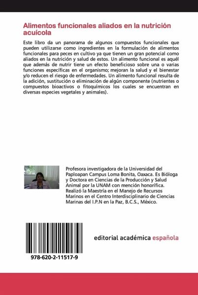 Este libro da un panorama de algunos compuestos funcionales que pueden utilizarse como ingredientes en la formulación de alimentos funcionales para peces en cultivo ya que tienen un gran potencial como aliados en la nutrición y salud de estos. Un alimento funcional es aquél que además de nutrir tiene un efecto beneficioso sobre una o varias funciones específicas en el organismo; mejoran la salud y el bienestar y/o reducen el riesgo de enfermedades. Un alimento funcional resulta de la adición, sustitución o eliminación de algún componente (nutrientes o compuestos bioactivos o fitoquímicos los cuales se encuentran en diversas especies vegetales y animales).