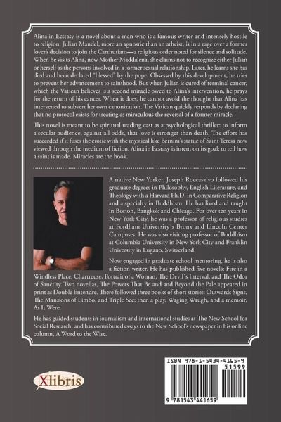 Alina in Ecstasy is a novel about a man who is a famous writer and intensely hostile to religion. Julian Mandel, more an agnostic than an atheist, is in a rage over a former lover's decision to join the Carthusians-a religious order noted for silence and solitude. When he visits Alina, now Mother Maddalena, she claims not to recognize either Julian or herself as the persons involved in a former sexual relationship. Later, he learns she has died and been declared "blessed" by the pope. Obsessed by this development, he tries to prevent her advancement to sainthood. But when Julian is cured of terminal cancer, which the Vatican believes is a second miracle owed to Alina's intervention, he prays for the return of his cancer. When it does, he cannot avoid the thought that Alina has intervened to subvert her own canonization. The Vatican quickly responds by declaring that no protocol exists for treating as miraculous the reversal of a former miracle. This novel is meant to be spiritual reading cast as a psychological thriller: to inform a secular audience, against all odds, that love is stronger than death. The effort has succeeded if it fuses the erotic with the mystical like Bernini's statue of Saint Teresa now viewed through the medium of fiction. Alina in Ecstasy is intent on its goal: to tell how a saint is made. Miracles are the hook.