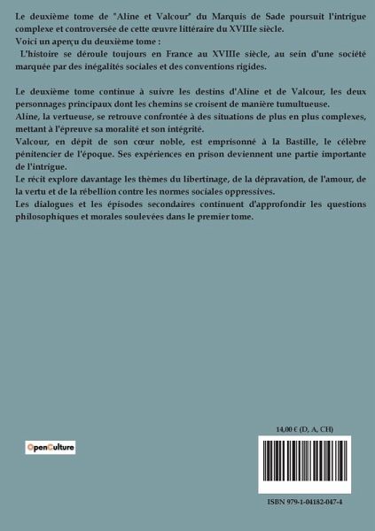 "Aline et Valcour" est un roman épistolaire du Marquis de Sade, écrit à la Bastille avant le changement majeur en France. Le récit se déroule principalement à travers des lettres échangées entre les personnages principaux, Aline et Valcour, ainsi que leurs proches. L'histoire commence avec Déterville, un ami de Valcour, qui s'inquiète de l'absence de ce dernier lors d'un dîner chez Aline, la femme qu'il aime. Aline, de son côté, est confrontée à la pression de son père, M. de Blamont, qui souhaite la marier à M. d'Olbourg, un homme instable mais ridicule. Aline et sa mère, Madame de Blamont, tentent de résister à cette union imposée, espérant gagner du temps pour permettre à Aline de suivre son cur. Valcour, désespéré par la perspective de perdre Aline, lui écrit pour exprimer son amour et sa douleur. Il partage également avec elle l'histoire de sa vie, marquée par des erreurs de jeunesse, un duel tragique et une fuite forcée à l'étranger. Malgré ses malheurs, Valcour espère que son amour pour Aline pourra surmonter les obstacles sociaux et familiaux. Le roman explore des thèmes tels que l'amour, la liberté individuelle, les conventions sociales et les préjugés, tout en offrant une critique des institutions et des valeurs de l'époque.