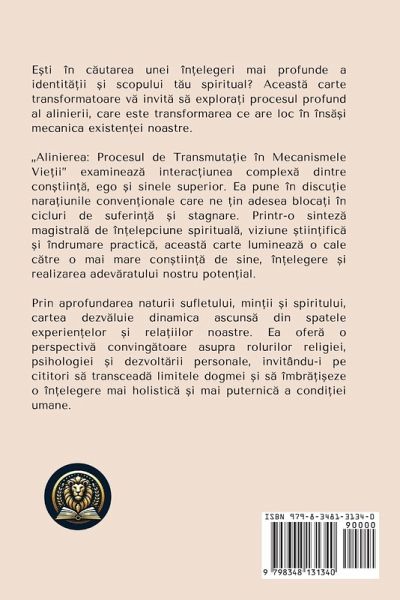 E¿ti în c¿utarea unei în¿elegeri mai profunde a identit¿¿ii ¿i scopului t¿u spiritual? Aceast¿ carte transformatoare v¿ invit¿ s¿ exploräi procesul profund al alinierii, care este transformarea ce are loc în îns¿¿i mecanica existen¿ei noastre."Alinierea: Procesul de Transmutäie în Mecanismele Vie¿ii" examineaz¿ interac¿iunea complex¿ dintre con¿tiin¿¿, ego ¿i sinele superior. Ea pune în discu¿ie naräiunile conven¿ionale care ne ¿in adesea blocäi în cicluri de suferin¿¿ ¿i stagnare. Printr-o sintez¿ magistral¿ de în¿elepciune spiritual¿, viziune ¿tiin¿ific¿ ¿i îndrumare practic¿, aceast¿ carte lumineaz¿ o cale c¿tre o mai mare con¿tiin¿¿ de sine, în¿elegere ¿i realizarea adev¿ratului nostru poten¿ial.Prin aprofundarea naturii sufletului, min¿ii ¿i spiritului, cartea dezv¿luie dinamica ascuns¿ din spatele experien¿elor ¿i reläiilor noastre. Ea ofer¿ o perspectiv¿ conving¿toare asupra rolurilor religiei, psihologiei ¿i dezvolt¿rii personale, invitându-i pe cititori s¿ transcead¿ limitele dogmei ¿i s¿ îmbr¿¿i¿eze o în¿elegere mai holistic¿ ¿i mai puternic¿ a condi¿iei umane.Fie c¿ c¿utäi r¿spunsuri la cele mai profunde întreb¿ri ale vie¿ii, v¿ luptäi s¿ v¿ eliberäi de convingerile limitative sau tânji¿i dup¿ o existen¿¿ mai plin¿ de sens ¿i mai împlinit¿, aceast¿ explorare aprofundat¿ a procesului de aliniere v¿ va servi drept ghid transformator. Preg¿te¿te-te s¿ porne¿ti într-o c¿l¿torie de autodescoperire, de evolu¿ie spiritual¿ ¿i de deblocare a celui mai înalt poten¿ial al t¿u.
