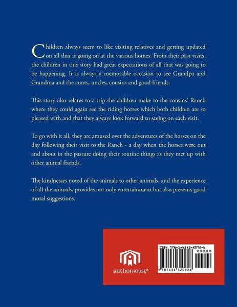 Children always seem to like visiting relatives and getting updated on all that is going on at the various homes. From their past visits, the children in this story had great expectations of all that was going to be happening. It is always a memorable occasion to see Grandpa and Grandma and the aunts, uncles, cousins and good friends. This story also relates to a trip the children make to the cousins' Ranch where they could again see the riding horses which both children are so pleased with and that they always look forward to seeing on each visit. To go with it all, they are amused over the adventures of the horses on the day following their visit to the Ranch - a day when the horses were out and about in the pasture doing their routine things as they met up with other animal friends. The kindnesses noted of the animals to other animals, and the experience of all the animals, provides not only entertainment but also presents good moral suggestions.