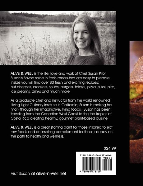 ALIVE & WELL is a great starting point for those inspired to eat raw foods and a delicious journey for those already on the path to health and wellness. Inside you will find over 80 fresh and exciting recipes: nut cheeses, crackers, breads, soups, smoothies, milks, burgers, falafel, pizza, sushi, pies, ice creams and much more. All raw, healthy and super tasty. ALIVE & WELL is the life, love and work of Chef Susan Prior.