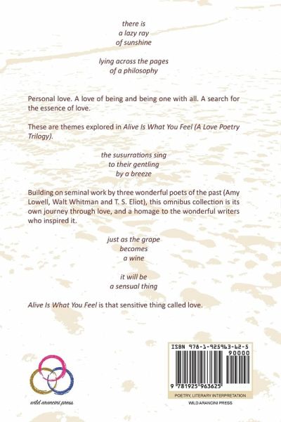 there is a lazy ray of sunshine lying across the pages of a philosophy Personal love. A love of being and being one with all. A search for the essence of love. These are themes explored in Alive Is What You Feel (A Love Poetry Trilogy). the susurrations sing to their gentling by a breeze Building on seminal work by three wonderful poets of the past (Amy Lowell, Walt Whitman and T. S. Eliot), this omnibus collection is its own journey through love, and a homage to the wonderful writers who inspired it. just as the grape becomes a wine it will be a sensual thing Alive Is What You Feel is that sensitive thing called love.