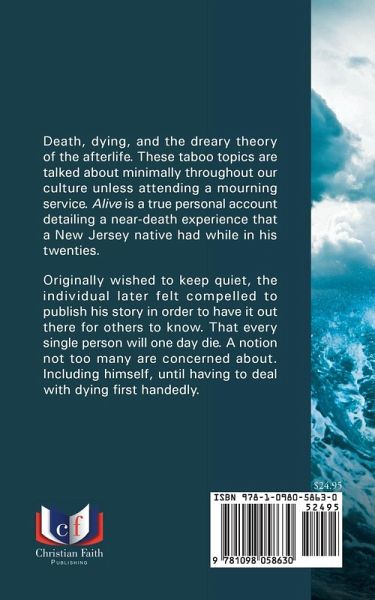 Death, dying, and the dreary theory of the afterlife. These taboo topics are talked about minimally throughout our culture unless attending a mourning service. Alive is a true personal account detailing a near-death experience that a New Jersey native had while in his twenties. Originally wished to keep quiet, the individual later felt compelled to publish his story in order to have it out there for others to know. That every single person will one day die. A notion not too many are concerned about. Including himself, until having to deal with dying first handedly.