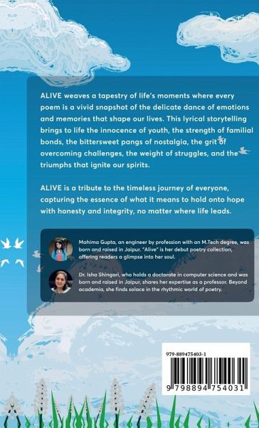 ALIVE weaves a tapestry of life's moments where every poem is a vivid snapshot of the delicate dance of emotions and memories that shape our lives. This lyrical storytelling brings to life the innocence of youth, the strength of familial bonds, the bittersweet pangs of nostalgia, the grit of overcoming challenges, the weight of struggles and the triumphs that ignites our spirits. ALIVE is a tribute to the timeless journey of everyone, capturing the essence of what it means to hold onto hope with honesty and integrity, no matter where life leads.