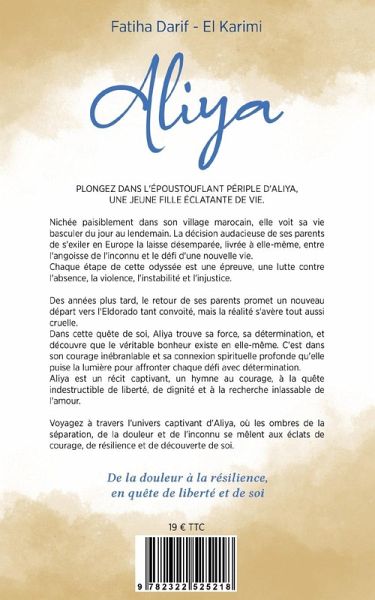 Nichée paisiblement dans son village marocain, Aliya voit sa vie basculer du jour au lendemain. La décision audacieuse de ses parents de s'exiler en Europe la laisse désemparée, livrée à elle-même, entre l'angoisse de l'inconnu et le défi d'une nouvelle vie. Chaque étape de cette odyssée est une épreuve, une lutte contre l'absence, la violence, l'instabilité, et l'injustice. Des années plus tard, le retour de ses parents promet un nouveau départ vers l'Eldorado tant convoité, mais la réalité s'avère tout aussi cruelle. Dans cette quête de soi, Aliya trouve sa force, sa détermination, et découvre que le véritable bonheur est en elle-même. C'est dans son courage inébranlable et sa connexion spirituelle profonde qu'elle puise la lumière pour affronter chaque défi avec détermination. Aliya est un récit captivant, un hymne au courage, à la quête indestructible de liberté, de dignité et à la recherche inlassable de l'amour. Voyagez à travers l'univers captivant d'Aliya, où les ombres de la séparation, de la douleur et de l'inconnu se mêlent aux éclats de courage, de résilience et de découverte de soi.