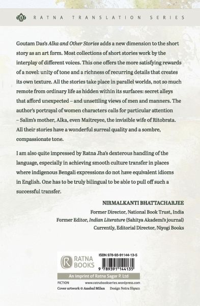 Goutam Das's Alka and Other Stories adds a new dimension to the short story as an art form. Most collections of short stories work by the interplay of different voices. This one offers the more satisfying rewards of a novel: unity of tone and a richness of recurring details that creates its own texture. All the stories take place in parallel worlds, not so much remote from ordinary life as hidden within its surfaces: secret alleys that afford unexpected - and unsettling views of men and manners. The author's portrayal of women characters calls for particular attention - Salim's mother, Alka, even Maitreyee, the invisible wife of Ritobrata. All their stories have a wonderful surreal quality and a sombre, compassionate tone. I am also quite impressed by Ratna Jha's dexterous handling of the language, especially in achieving smooth culture transfer in places where indigenous Bengali expressions do not have equivalent idioms in English. One has to be truly bilingual to be able to pull off such a successful transfer. NIRMALKANTI BHATTACHARJEE Former Director, National Book Trust, India Former Editor, Indian Literature (Sahitya Akademi's journal) Currently, Editorial Director, Niyogi Books