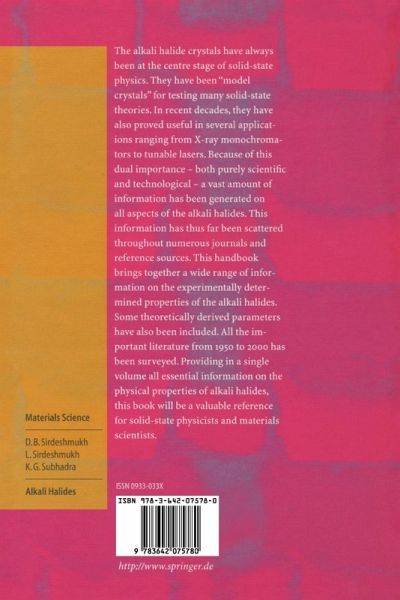 The alkali halide crystals have always been at the centre stage of solid-state physics. They have been "model crystals" for testing many solid-state theories. In recent decades, they have also proved useful in several applications ranging from X-ray monochromators to tunable lasers. Because of this dual importance - both purely scientific and technological - a vast amount of information has been generated on all aspects of the alkali halides. This information has thus far been scattered throughout numerous journals and reference sources. This handbook brings together a wide range of information on the experimentally determined properties of the alkali halides. Some theoretically derived parameters have also been included. All the important literature from 1950 to 2000 has been surveyed. Providing in a single volume all essential information on the physical properties of alkali halides, this book will be a valuable reference for solid-state physicists and materials scientists.