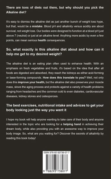 There are tons of diets out there, but why should you pick the Alkaline diet? It's easy to dismiss the alkaline diet as just another bunch of weight loss hype, but that, would be a mistake. Blood pH and alkalinity versus acidity are about survival, not weight loss. Our bodies were designed to function at a blood pH just above 7 (neutral) or just at an alkaline level. Anything more acidic by even a few points, can mean serious health consequences. So, what exactly is this alkaline diet about and how can it help me get to my desired weight? The alkaline diet is an eating plan often used to enhance health. With an emphasis on fresh vegetables and fruits, it's based on the idea that after all foods are digested and absorbed, they reach the kidneys as either acid-forming or base-forming compounds. How does this translate to you? Well, not only does this improve your health, but the alkaline diet also preserves your muscle mass, slows the aging process and protects against a variety of health problems ranging from headaches and the common cold to even diabetes, cardiovascular diseases, kidney stones and osteoporosis. The best exercises, nutritional intake and advice to get your body looking just the way you want it I hope my book will help anyone wanting to take care of their body and anyone interested in the topic who are looking for a helping hand in achieving their dream body, while also providing you with an awesome way to improve your body image. So, what are you waiting for? Discover the secrets of alkalinity by reading this book today!